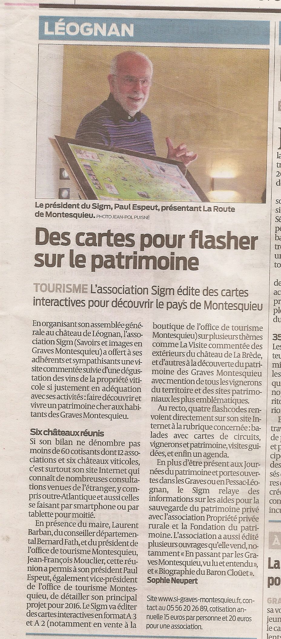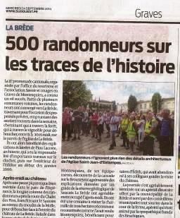 **** 21 septembre 2014 : photo de l'article du journal quotidien Sud Ouest après la promenade cantonale vers La Brède du 21 septembre 2014 ( 500 promeneurs); un Journal est encore disponible pour les promenades de Saucats , Cadaujac , la Brède ...contacter SIGM