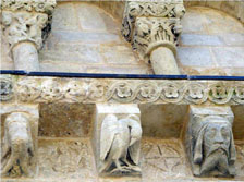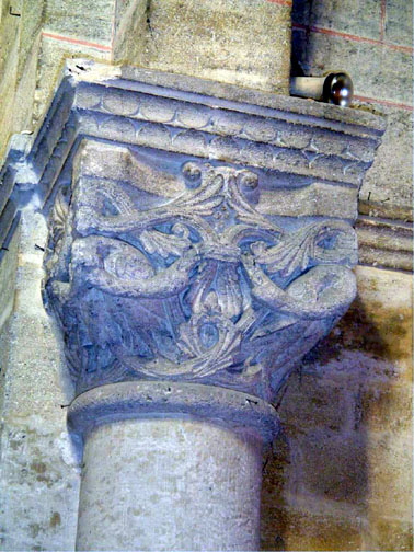 Le chapiteau double conservé au nord de la porte, couronnant les colonnettes doubles de la voussure extérieure, probablement parce qu’il présente, aux angles, deux boules sculptées en coquille qui pourraient être interprétées comme un symbole jacquaire en relation avec l’Hospital des Templiers, possession de la Sauve Majeure, qui portait assistance aux pèlerins et aux malades.