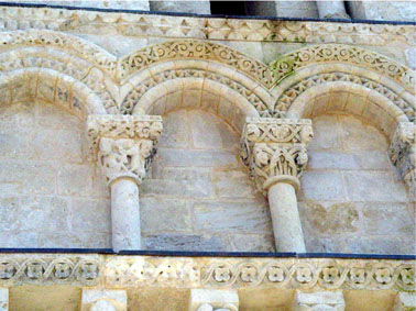 Un arc de décharge en plein cintre reposant sur de simples impostes occupait le second niveau, tandis que des arcs géminés, dont les cintres retombaient sur un chapiteau sculpté et une courte colonnette, étaient plaqués au troisième niveau.
