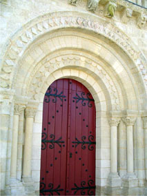En, bas s’ouvre un portail en plein cintre, sans tympan, qui développe une archivolte à trois voussures, la voussure externe retombant, par l’intermédiaire de chapiteaux sculptés, sur des colonnettes géminées, les deux autres sur des colonnettes simples. Ce niveau se termine par une corniche saillante, soutenue par d’importants modillons sculptés, alternant avec des métopes, également sculptés.