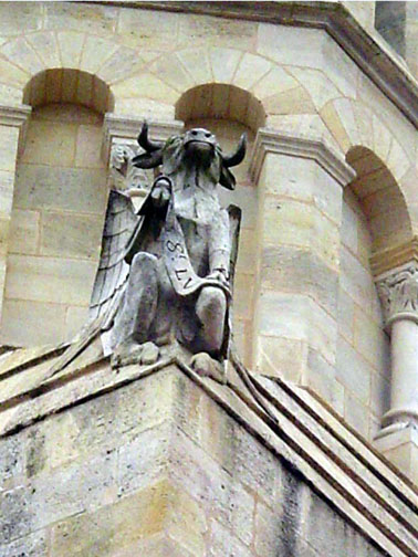 Si on fait le tour du clocher, on remarque les quatre évangélistes, représentés sous leur forme animale. Traditionnellement Saint Luc est figuré par le taureau, St Marc par le lion, l’Ange est associé à St Mathieu et l’aigle à St Jean.